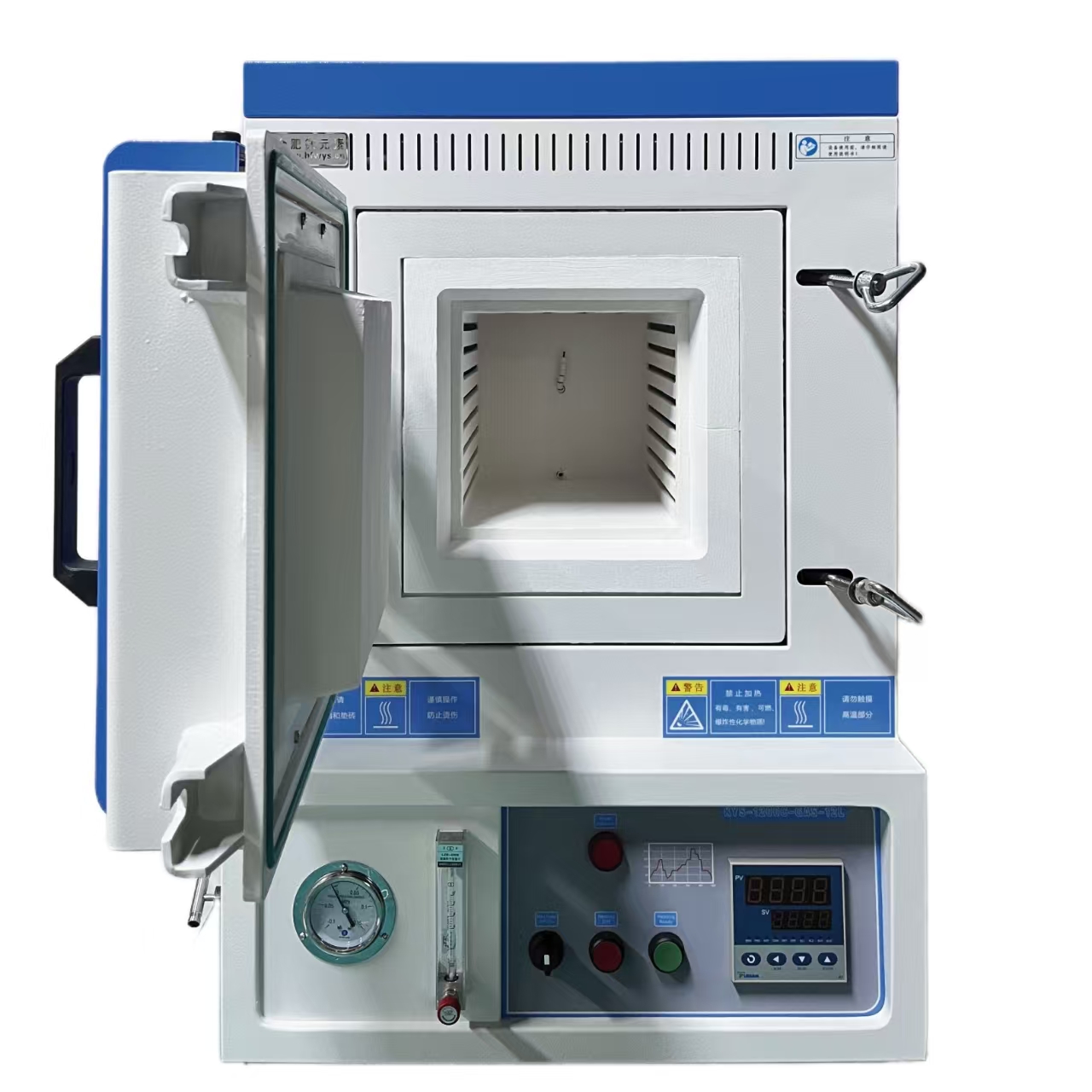 ?真空密封:爐門采用整體平面磨銑,硅膠條內嵌密封,具有密封性強,爐門開啟、關閉方便;預留真空,氣路接口,可配合真空系統,混氣系統使用,可通惰性氣體等,禁止通入有毒有害氣體,可接真空泵,配機械壓力表-0.1-0.15MPa,浮子流量計10-10ml/min;真空度可達-0.1mPa。